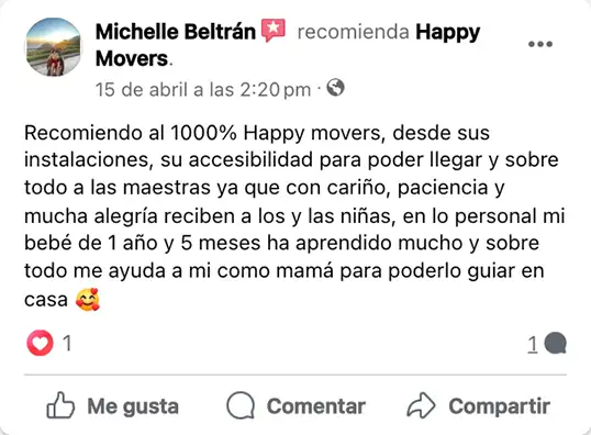 Nuestra directora fundó Happy Movers con el deseo de brindar una educación de calidad a los niños pequeños. Basada en el respeto mutuo y el amor. Que como toda madre anhela para sus hijos.